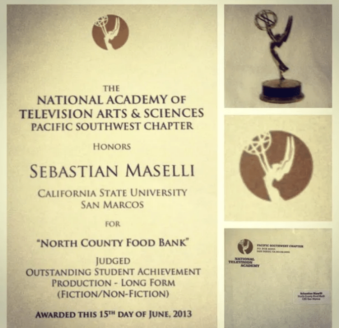 Awarded by the Academy of Television Arts & Sciences. Needless to say I am THRILLED! I was truly fortunate to work with an amazing group of people for this project and I hope to work with them again in the future. I was involved in all aspects of this project, from start to finish, mainly as one of the editors and camera operators. It felt great to be able to help out the North County Food Bank accomplish their mission and bring awareness as well as more donations to the cause. Unfortunately, I do not have a good quality link for this video (meaning it is not in high definition).